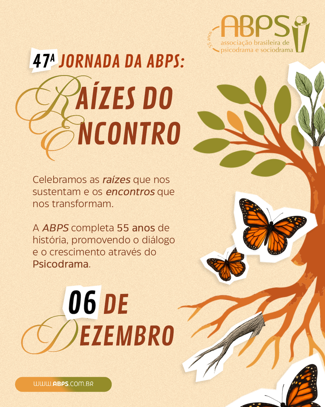 A 47ª Jornada da ABPS: Raízes do Encontro celebra o espaço onde o Psicodrama se renova a cada troca. Em 2025, a ABPS completa 55 anos de história, e esta edição especial propõe um mergulho nas nossas origens, nas relações que nos sustentam e nos encontros que nos transformam. Serão dois dias de vivências, debates e reflexões sobre o que mantém viva a prática psicodramática e seus vínculos com a sociedade contemporânea.