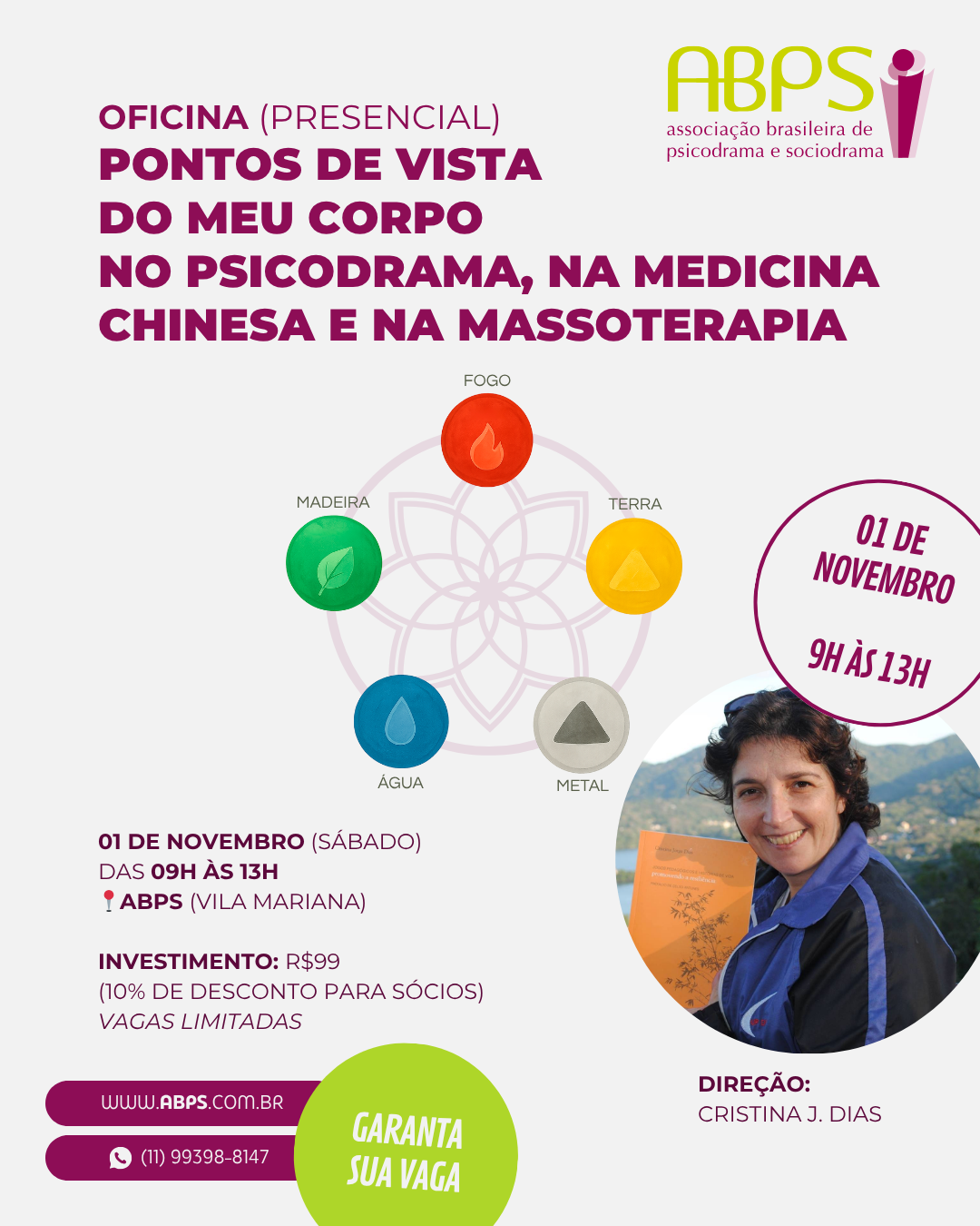 Pontos de vista do meu corpo no Psicodrama, na Medicina Chinesa e na Massoterapia é uma oficina vivencial que propõe um olhar integrador sobre o corpo, as emoções e a saúde. Conduzida por Cristina J. Dias, psicóloga e massoterapeuta, a atividade convida os participantes a explorarem a mandala dos Cinco Elementos da Medicina Chinesa, madeira, fogo, terra, metal e água, em diálogo com os princípios do Psicodrama. Por meio dessa experiência, será possível reconhecer os biotipos corporais, compreender as emoções predominantes e ampliar a consciência sobre as interações entre corpo e mente.