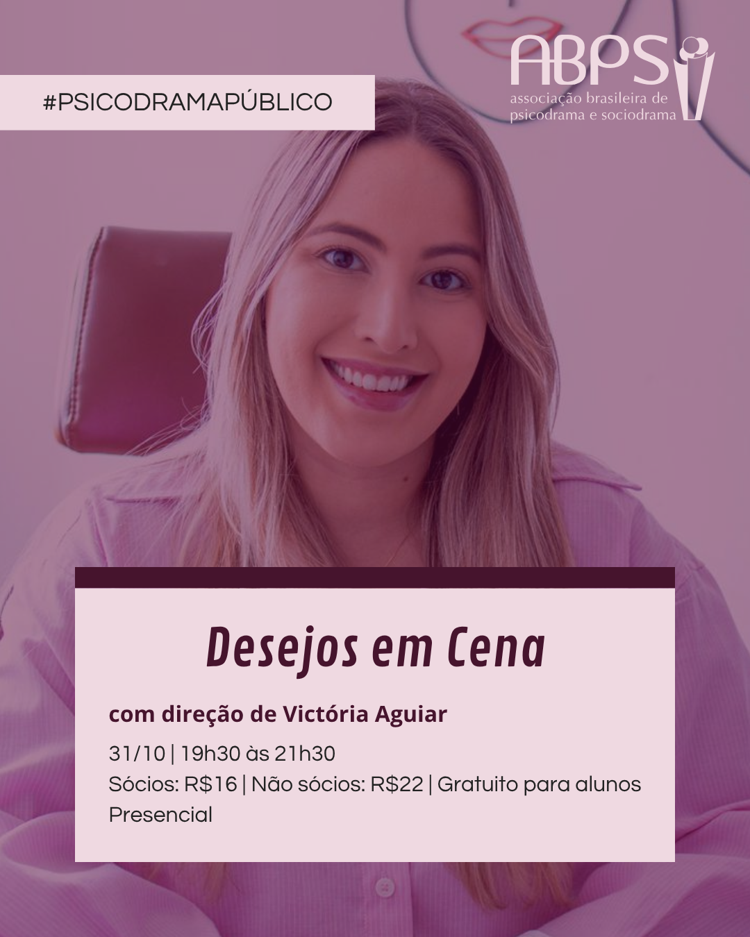 Desejos em Cena é uma vivência psicodramática conduzida por Victória Aguiar, psicóloga e sexóloga, que convida os participantes a explorarem, de forma simbólica e acolhedora, os sentidos da sexualidade em suas vidas. A proposta parte do entendimento de que os desejos ultrapassam o campo do sexual, atravessam o corpo, os vínculos, os afetos e a identidade. Por meio de técnicas de psicodrama, sensibilização e construção de cenas, o encontro propõe refletir sobre crenças, bloqueios e possibilidades ligadas à sexualidade, abrindo espaço para ressignificar experiências e habitar o próprio corpo com mais presença.